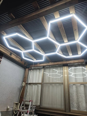 The hexagonal panels spread light in multiple directions to reduce shadows and create even illumination across the entire garage, so you get consistent visibility when working on cars or projects.